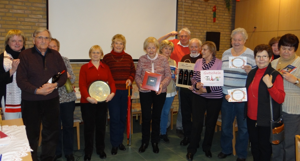 Vorsitzende Astrid Hanske (links) und die just beschenkten Neumitglieder Klaus von Wirth, Gisela von Wirth, Valentina Edich, Ilona Kietzmann, Helene Odendahl, Waltraud Schrade, Paul Kuckling (der Mann an der Lostrommel), Joseph Schmitt, Helga Schmitt, Helga Biefang, Ingrid Renoth, Christa Grenz sowie Inge Bartolucci (Foto: Christel Wirtgen)