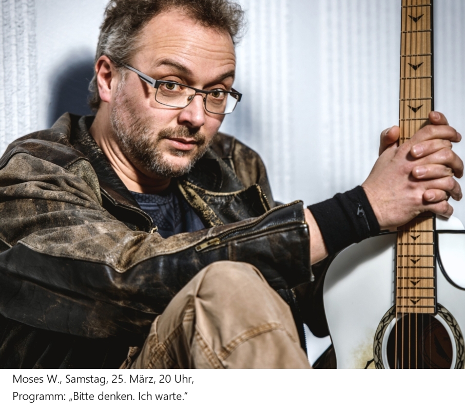 Im März steht zuerst „Damenbesuch“ an am Samstag, 11. März, 20 Uhr, und zwar „unbeschreiblich weiblich“. In rasantem Tempo plaudern drei Damen selbstironisch und humorvoll in Wort und Lied darüber, wie man sich als geschiedene Frau Mitte 30 im Leben zurechtfindet. Am Samstag, 25. März, 20 Uhr, erlebt der werte Gast Moses W. auf der Bühne. Bei „Bitte denken. Ich warte.“ handelt es sich um Standup-Kabarett mit Musik. Bei Absurditäten des Alltags geht es durch das Dickicht des Unlogischen. Das Quartal wird beschlossen am Freitag, 31. März, 20 Uhr, mit „Die Goldenen Reiter“. Klaro, kein Klischee wird ausgelassen, kein NDW-Hit bleibt ungewürdigt und kein Auge trocken, wenn die Reiter durch nie vergessene Partylandschaften galoppieren (alle Termine VVK: 14 €, AK: 16 €).