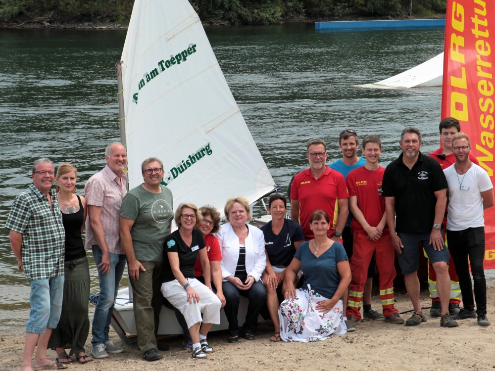 1 – Zur offiziellen Eröffnung des 1. Seefestes mit Bezirksbürgermeisterin Astrid Hanske (7. vl) präsentierten sich die Macher Michael und Anette König (Wasserski am Toepper, Gastgeber, 4. und 5. vl), Petra Müller-Mehrholz (6. vl) und Melanie Moldenhauer (Schirmherr Runder Tisch Rumeln-Kaldenhausen, 9. vl) zusammen mit den Repräsentanten der Brettsegler Rheinhausen, der WRK, der DLRG und des ASV Gut Biss Rumeln-Kaldenhausen.