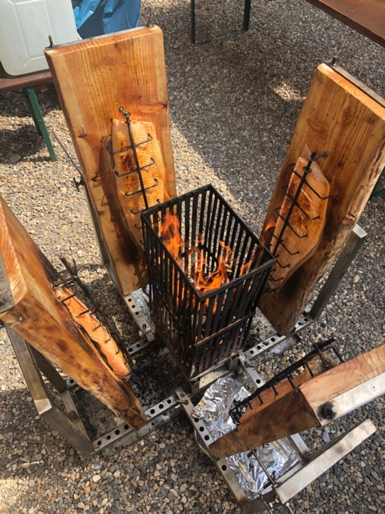 4 – Wenn die geräucherten Forellen des ASV Gut Biss Rumeln-Kaldenhausen schon Kultstatus haben, so sind es die Flammlachs-Delikatessen um so mehr. Unser Bild zeigt die Zubereitung „mal vier“.
