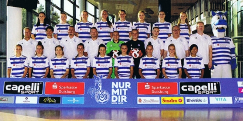 Mit diesem Team will der MSV Duisburg die Frauenfußball-Bundesliga rocken hinten von links: Symela Ciesielska, Claire O'Riordan, Lisa-Marie Makas, Dörthe Hoppius, Carolin-Sophie Härling, Pia Rybacki, Meikayla Moore und Naomi Gottschling; mitte von links: Cheftrainer Thomas Gerstner, Co-Trainer Robert Augustin, Torwart-Trainer Marc Ernzer, Physiotherapeut Arthur Jarzombeck, Laura Lücker, Meike Kämper, Physio Timo Scheel, Mannschaftsarzt Dr. Claus Petsch, Zeugwart Christian Mittelbach und Maskottchen Ennatz; vorne von links: Sabine Stoller, Kathleen Radtke, Alina Angerer, Emma Rolston, Barbara Dunst, Geldona Morina, Yvonne Zielinski, Magdalena Richter und Fuko Takahashi