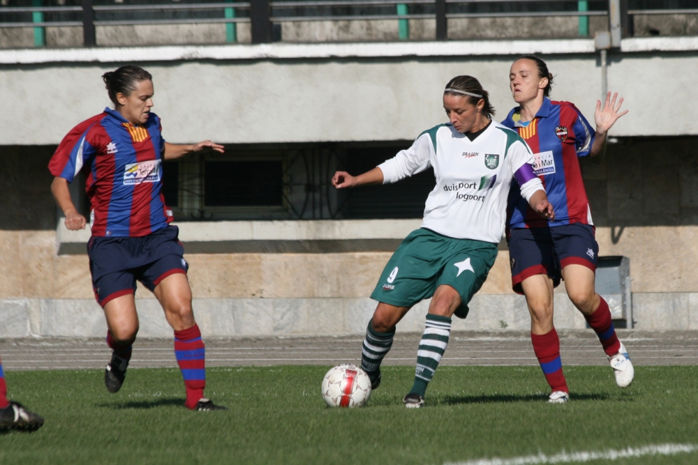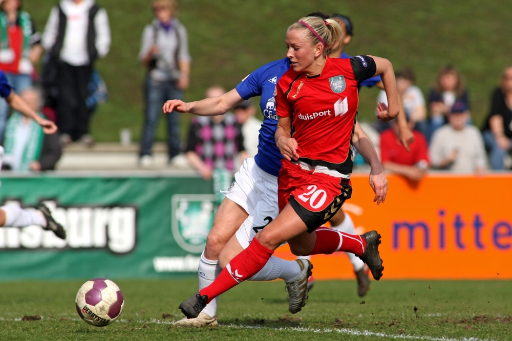 Auch der spanische Meister UD Levante hat gegen die blendend aufgelegten Spielerinnen von Martina Voss nicht die Spur einer Chance, hier zeigt Inka Grings ihre Zweikampfstärke. Das Spiel am 12. Oktober 2008 endet gnädig, 5:0 für den FCR 2001 Duisburg.