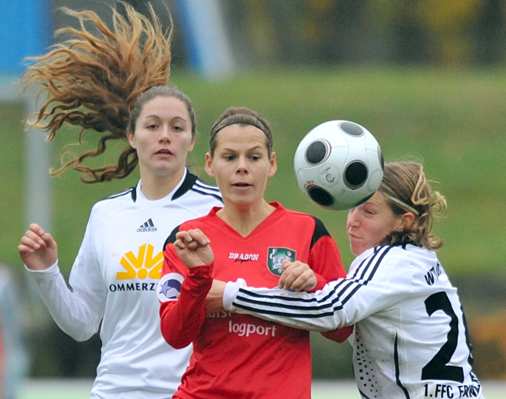 Locker mit 3:1 fiedelt Duisburg im Viertelfinale Titelverteidiger FFC Frankfurt schon auf deren Geläuf weg (6. November 2008), im Rückspiel kommt noch ein knackiges 2:0 hinzu. Unser Schnappschuss vom Stadion m Brentanobad zeigt eine mehr verträumte Spielszene mit Evergreen Jennifer Oster.