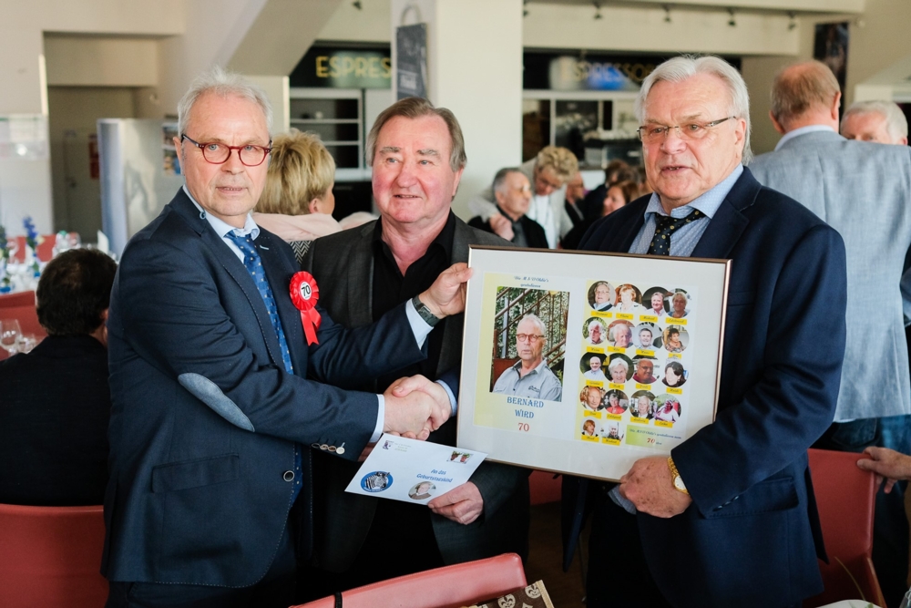 1 - Legenden unter sich: Bernard Dietz bekam von Michael Bella (mitte) und Dietmar Linders unter anderem eine sehr persönliche Bilder-Collage überreicht.
