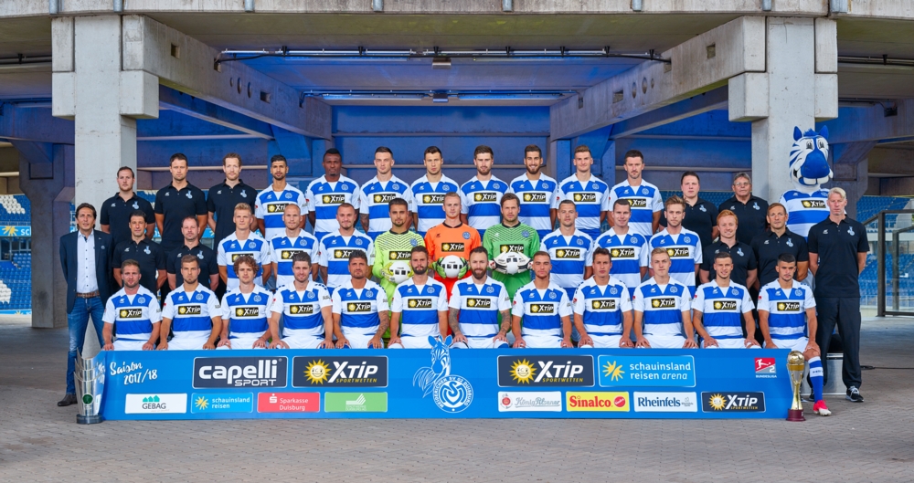 Mit dieser Mannschaft hat Aufsteiger MSV Duisburg den Klassenerhalt in der 2. Liga geschafft (hinten von links): Physiotherapeut Timo Kleinefehn, Physiotherapeut Oliver Grabowski, Mannschaftsarzt Dr. Falk Ullerich, Enis Hajri, Kingsley Onuegbu, Boris Tashchy (ab 4. 7. 2017), Lukas Fröde, Dustin Bomheuer, Tugrul Erat, Thomas Blomeyer, Branimir Bajic, Zeugwart Sascha Jordan, Zeugwart Manni Piwonski und Maskottchen Ennatz; mitte von links: Sportdirektor Ivo Grlic, Cheftrainer Ilia Gruev, Co-Trainer Yontcho Arsov, Dan-Patrick Poggenberg, Gerrit Nauber, Simon Brandstetter (bis 1. 1. 2018), Daniel Zeaiter, Mark Flekken, Daniel Davari, Stanislav Iljutcenko, Thomas Bröker (bis 11. 1. 2018), Marius Krüger, Spielanalyst Philipp Klug, Fitness-Trainer Andreas Tappe und Torwart-Trainer Sven Beuckert; vorne von links: Nico Klotz, Kevin Wolze, Mael Corboz (bis 31. 1. 2018), Moritz Stoppelkamp, Baris Özbek, Tim Albutat, Zlatko Janjic (bis 6. 2. 2018), Ahmet Engin, Fabian Schnellhardt, Lukas Daschner, Andreas Wiegel und Cauly Oliveira Souza; nicht auf dem Bild: Christian Gartner (ab 3. 1. 2018)