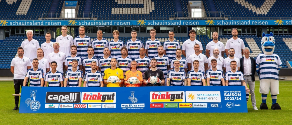 Die Zebras in der Spielzeit 2023/24 (obere Reihe von links): Team-Manager Matthias Wienig, Teamarzt Martin Schroeder, Teamarzt Dr. Robert Roenick, Sebastian Mai, Rolf Feltscher, Caspar Jander, Niklas Kölle, Jonas Michelbrink, Hamza Anhari, Athletik-Trainer Ruben Solis, Physiotherapeut Norman Marx, Physiotherapeut Oliver Grabowski; mittlere Reihe von links: Cheftrainer Torsten Ziegner, Co-Trainer Philipp Klug, Torwart-Trainer Sven Beuckert, Kolja Pusch, Baran Mogultay, Marvin Bakalorz, Alaa Bakir, Chinedu Ekene, Marvin Knoll, Thomas Pledl, Co-Trainer Michael Hiemisch, Zeugwart Omar Ahmad, Zeugwart Peter Lindner, Sport-Geschäftsführer Ralf Heskamp, vordere Reihe von links: Marvin Senger, Santiago Castaneda, Phillip König, Pascal Köpke, Dennis Smarsch, Max Braune, Vincent Müller, Niclas Stierlin, Benjamin Girth, Tobias Fleckstein und Joshua Bitter (Foto MSV Duisburg).