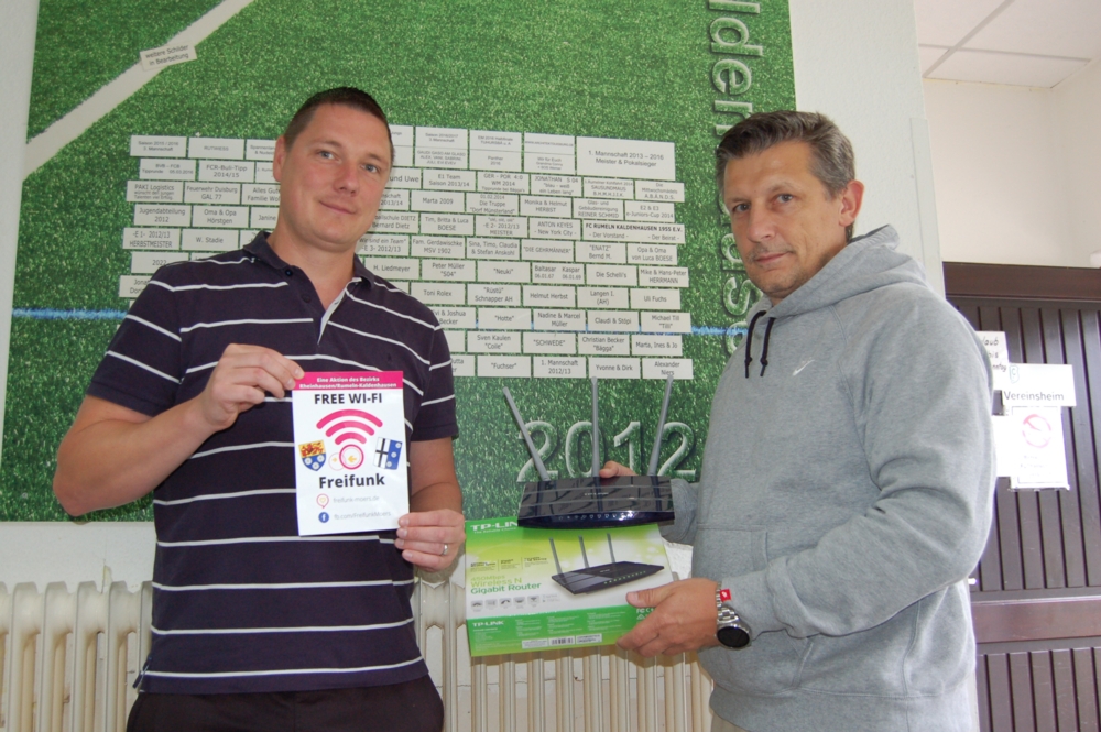 1 – Vorsitzender Daniel Stöpke und IT-Beauftragter Bernhard Haiduk hatten die Ehre, als Erste am Projekt Freifunk beteiligt zu werden. Jetzt ist es beim FC Rumeln-Kaldenhausen „wie im Urlaubshotel“.