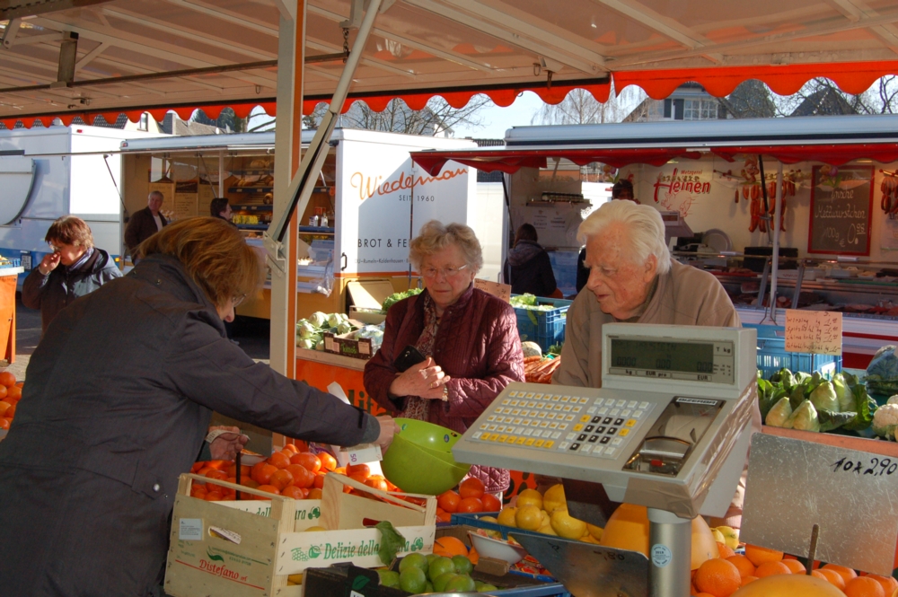 Obwohl im Ort die nationale Versorger-Phalanx Rewe, Edeka, Aldi, Lidl und Netto ein breit aufgestelltes Warenangebot feilbietet und dabei kaum eine Marktchance auslässt, hat sich der donnerstägliche Handelsplatz gut behaupten können. Natürlich merken die Frische-Spezialisten, dass „ihre“ Waren auch reichlich bei den niedergelassenen Kollegen zu haben sind, doch es gibt einige Dinge, die wohl nur in der Kultur des Open-Air-Treibens gedeihen. Wie selbstverständlich wird der eine oder andere Hinweis auf eine nicht alltägliche Frucht verbunden mit der Weitergabe einer Rezeptidee, der lässige Plausch und das Umgarnen der „jungen Frau“ und des „werten Herrn“ sind obligatorisch. Das Tauschgeschäft „Ware gegen Geld“ wird zelebriert wie schon seit Jahrhunderten. So verwundert es nicht, dass der Besuch des Wochenmarktes insbesondere für Frauen und die reife Generation zum Pflichtprogramm gehört.