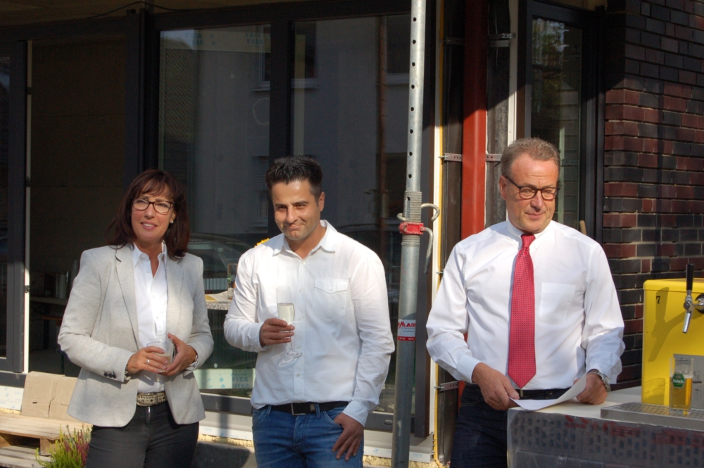 Unsere Bilder (zum Vergrößern bitte Anklicken) zeigen beim Richtfest die Investoren (vl) Annette Drifte-Brink, Hakan Yildirim und Tillmann Brink sowie in Höhe des Penthouse-Flachdachs den ungewöhnlich bunten Richtkranz.